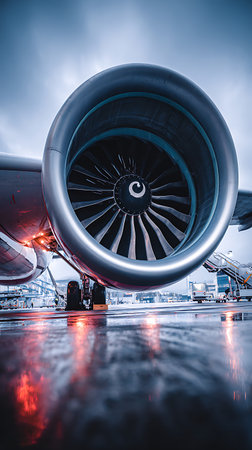Striking close-up showcases a large jet engine on an airplane, parked on a wet runway at an airport, with soft focus background details of infrastructure.