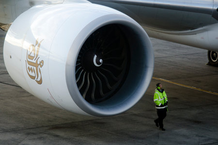 AUCKLAND - SEP 15: Airline safety engineer in Auckland International Airport on Sep 15 2013.He is required to diagnose and where possible rectify or eliminate any faults that may arise before flight.