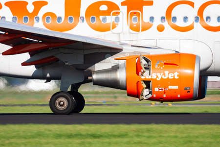 Amsterdam / Netherlands - August 13, 2014: EasyJet Airbus A319 G-EZFO passenger plane arrival and landing at Amsterdam Schipol Airport