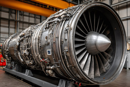 Detailed close-up view of an aircraft turbine engine showcasing its intricate design and engineering. The industrial backdrop enhances the aviation theme.