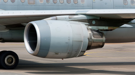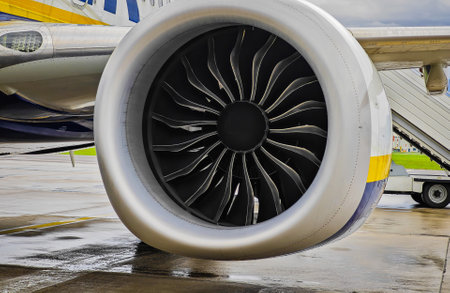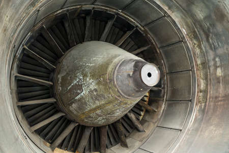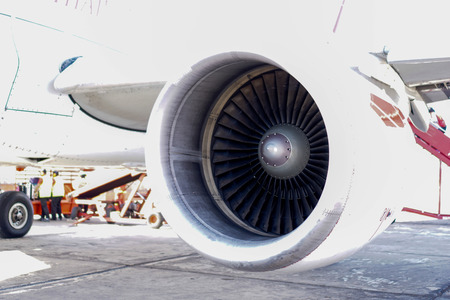 Jet engine of an modern airliner. Close up photo of an aircraft turbine at the airport