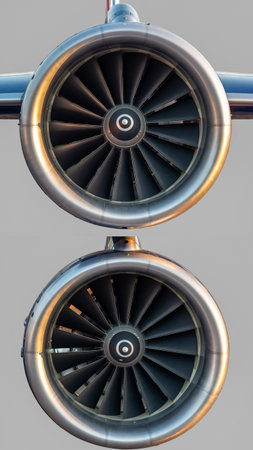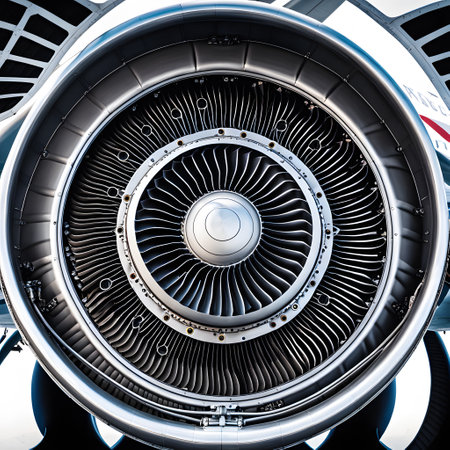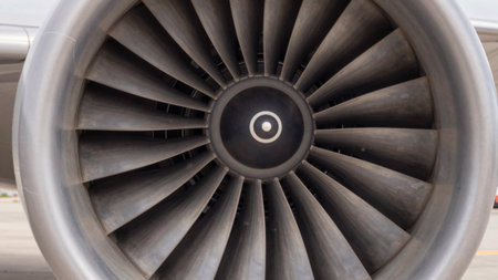Detailed view of a modern aircraft jet engine fan, showcasing the intricate design of the powerful metallic turbine blades