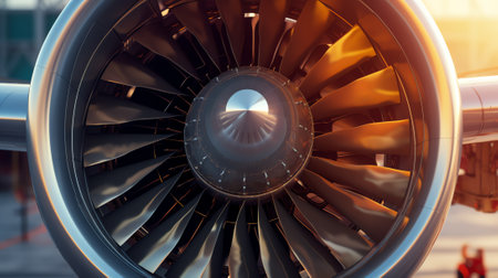 Highlighting the detailed design of a jet engine, this scene captures the massive turbine blades and the surrounding metal casing as sunlight reflects off the surfaces at the bustling airport.