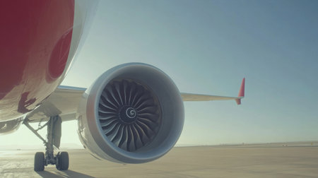 A detailed examination of a powerful jet engine reveals its complex design, reflecting sunlight and emphasizing the engineering marvel at an airport in the afternoon.