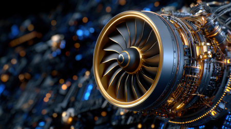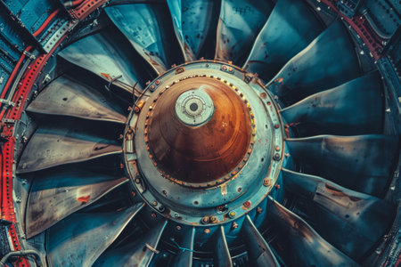 a jet engine's turbine blades, with a focus on the circular pattern and intricate engineering