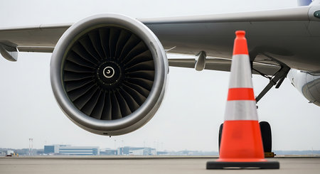 Detailed close-up view of an aircraft turbine engine showcasing its intricate design and engineering. The industrial backdrop enhances the aviation theme.