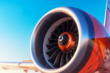 A turbine on the wing of a modern passenger aircraft. Turbine spinning, creating whirlwind of power, propelling plane to new heights.
