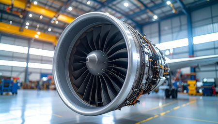 Intricate jet engine in industrial setting a showcase of engineering excellence and design detail