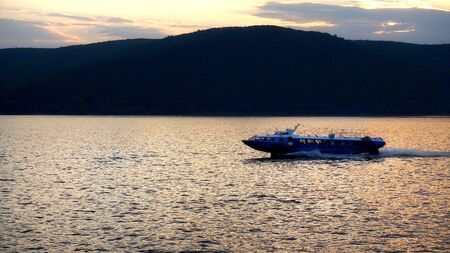 Passenger high-speed river ship glisser sails along the river towards sunset