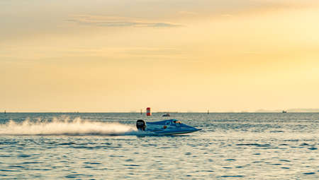 CHONBURI, THAILAND-NOVEMBER 25, 2017 : F5 boat with beautiful sky and sea in Bangsaen Power Boat 2017 at Bangsaen beach in Thailand