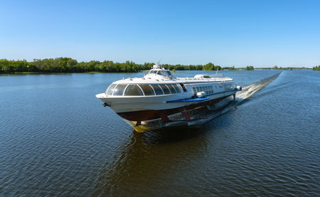 Meteor ship rushes down the river in summer