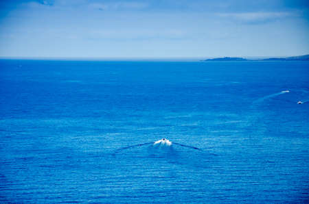 A boat in the sea races on the water, leaving a trail of foam on the water