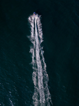 Aerial view of speed boat in motion. Water transportation and summer leisure time activity.