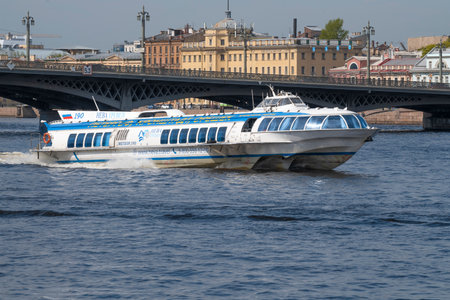 ST. PETERSBURG, RUSSIA - MAY 14, 2023: Meteor 190 hydrofoil close-up at the Annunciation Bridge on May Day