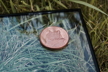 Digital currency physical brass dogecoin coin. Virtual cash concept.