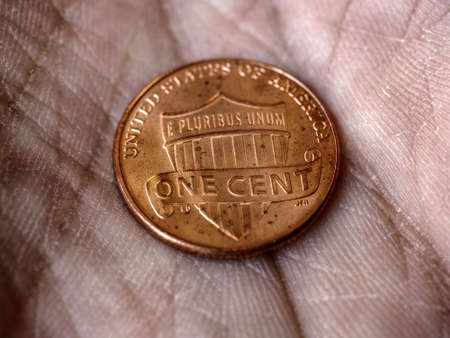 US American coin lies on a dirty male palm. 1 one cent penny close-up. Illustration on the theme of low salary, unemployment, pension, welfare, social benefit and poverty. Macro