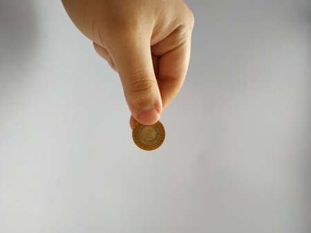 One small gold british pound in white man hand. Elizabeth II. British money concept.