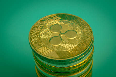 Ripple cryptocurrency coin in a young businessman hand. Disruptive blockchain technology concept and transfer of wealth.