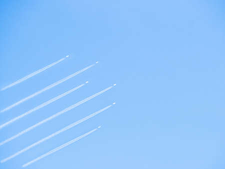 Chemtrails in the Sky. image with many airplane with condensation trail