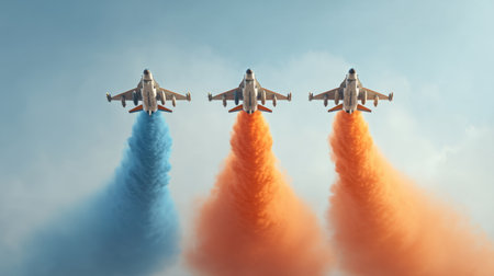 This stunning image captures three aircraft flying in tight formation, creating vibrant blue and orange smoke trails against a clear sky, showcasing amazing aerial performance.