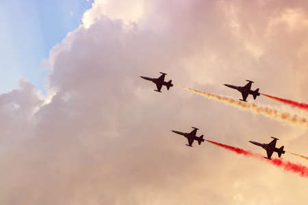 Aerobatic team group of fighters jet flies in the sky with brightly colored smoke under the setting sun in the evening sky.