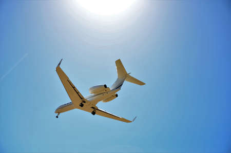 A commercial airplane flying overhead against a clear blue sky during bright daylight