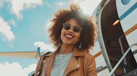 Traveller young happy woman boarding airplane on a sunny day alone.