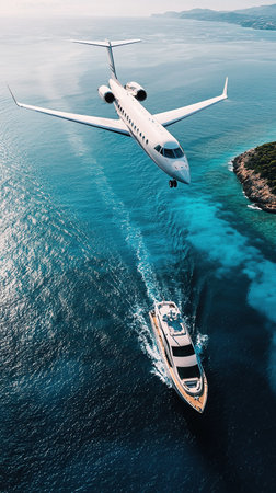 Dynamic composition of a modern airplane, train, and luxury ship on minimalist backdrop