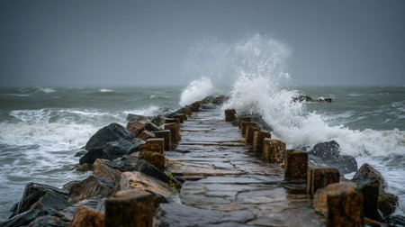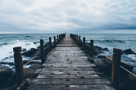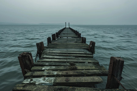 Old wooden pier stretches into choppy sea waters, capturing mood of solitude, stormy nature, and coastal power.
