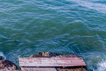 Custom wooden bench with sea view on the Caspian sea. Close-up.
