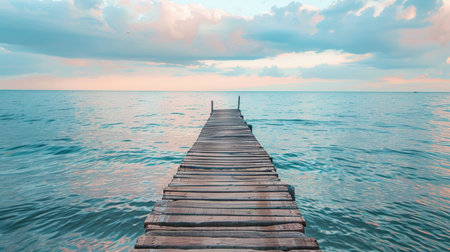 A wooden pier stretches into tranquil water under a dusky sky. Soft lighting illuminates the scene, casting reflections on the water's surface. The composition evokes a sense of peace and solitude. Suitable for illustrating travel, nature, or contemplative themes in various commercial and editorial projects.