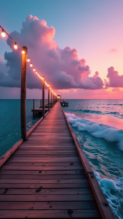 Enchanting sunset over ocean pier with dramatic cloudscape and soft waves.