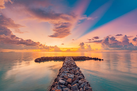 Amazing summer sunset wave breaker. Stones rocks sunset colors, sky clouds water reflections. Relaxing tranquil sunlight. Beauty travel seascape landscape, Mediterranean beach