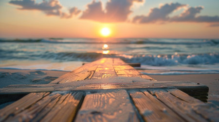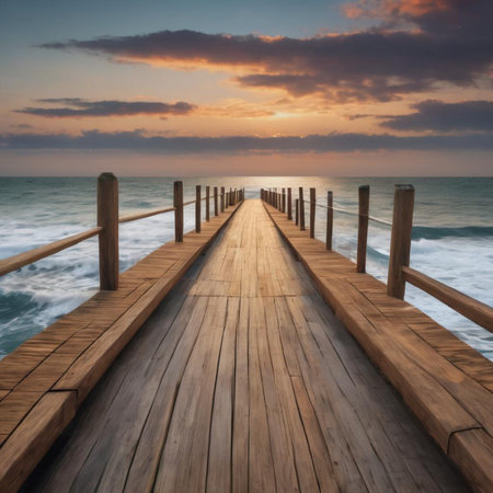 AI Generated. Rustic Wooden Planks Leading to a Calm Ocean at Sunset