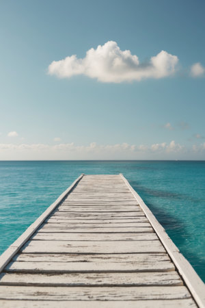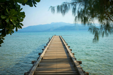 Scenic wooden pier stretches over clear turquoise waters, with gentle waves lapping against the shore, framed by sandy beach and vibrant greenery, evoking tranquility and peace