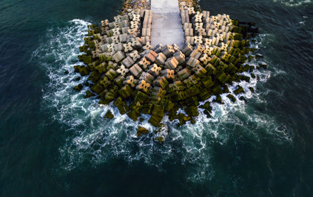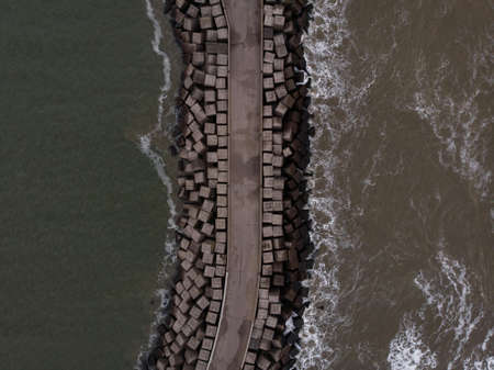 Aerial top down panorama view of rock stone block breakwater wavebreaker dam at Scheveningen beach The Hague Netherlands Europe