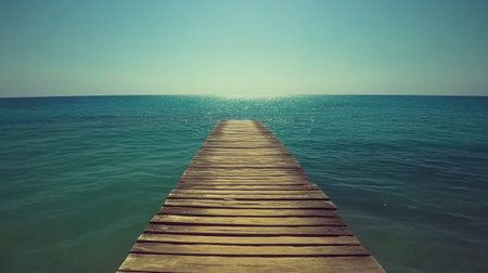 The wooden pier stretches out towards the tranquil sea, surrounded by a bright blue sky, inviting peaceful reflection at sunrise.