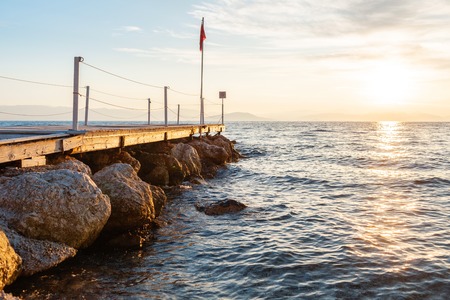 Wooden pier on the beach. Sunset and calm ocean. Calm. Stone beach of cold sea.