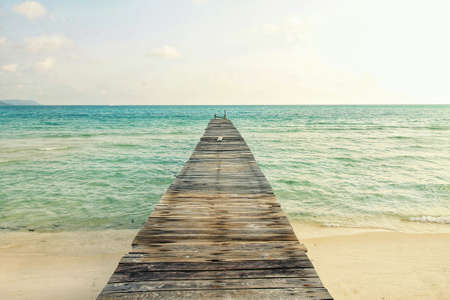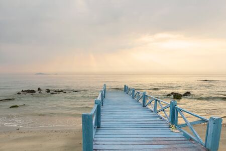 Wood bridge blue on the sea which has walk way for travel tourism and beautiful sky with sunshine in the morning. Sea waves slowly a the splashing on the sand and rocks with moss background.