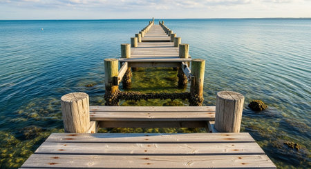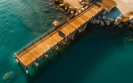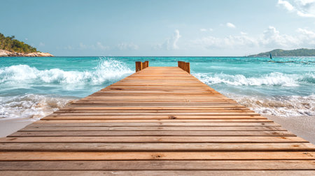 AI Generated. A wooden dock leading to clear blue ocean waters under a sunny sky
