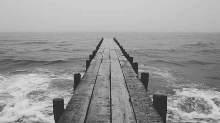 A lone wooden pier stretches into fog-shrouded ocean waves, creating a serene and isolated atmosphere. This monochrome image evokes feelings of tranquility and quiet reflection.