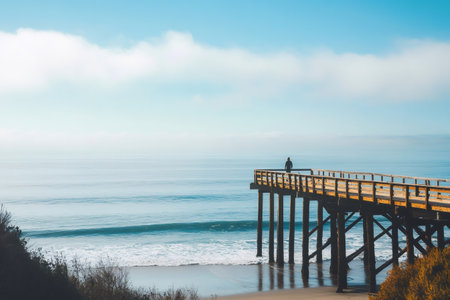 Man standing on wooden pier looking at ocean waves crashing on sandy beach on sunny day with clouds