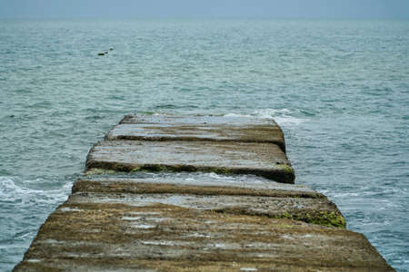 Wooden pier leading into the sea at sunset. Dramatic seascape.