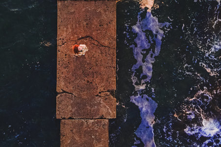 Captivating Bird's Eye View: Serene Gray Dock Anchored on Stunning Water Expanse • AR 3:2