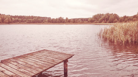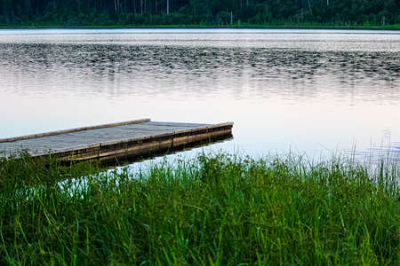 Forest river (lake) on a sunny day. Wooden pier. Clea sky, reflections in a crystal clear water. Idyllic landscape, rural scene. Nature, ecology, ecotourism, hiking, ecological resort, local tourism