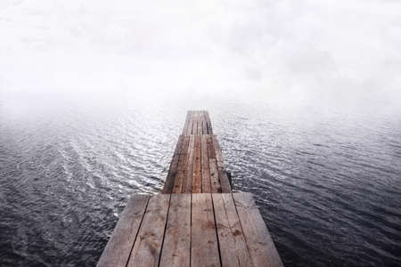 front view of wooden pier going into the water and fog,