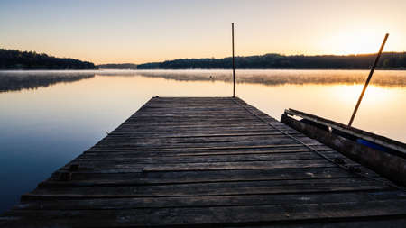 Wooden jetty on a lake at sunrise, with a mist in the background