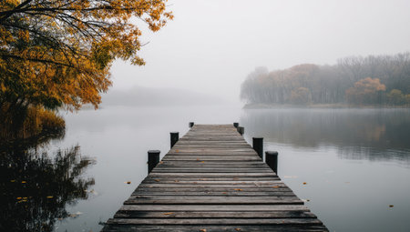 A wooden dock extends into a foggy lake, with scattered autumn leaves creating a tranquil atmosphere.