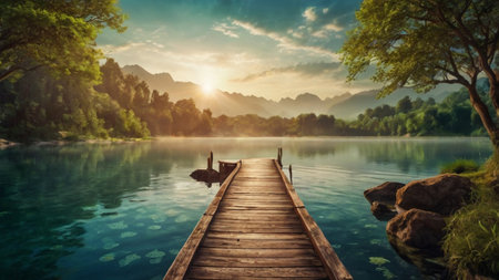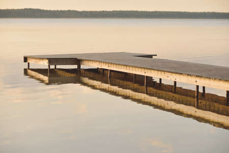 Wooden pier on the lake at sunrise. Beautiful landscape with a wooden pier.
