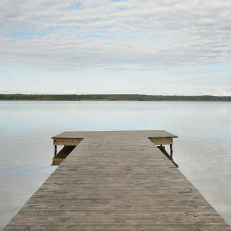 The fishing pier at the lake in rural Finland. Wooden pier at blue water and green forest on sunny day. Wooden jetty bridge with tranquil scene of seascape.